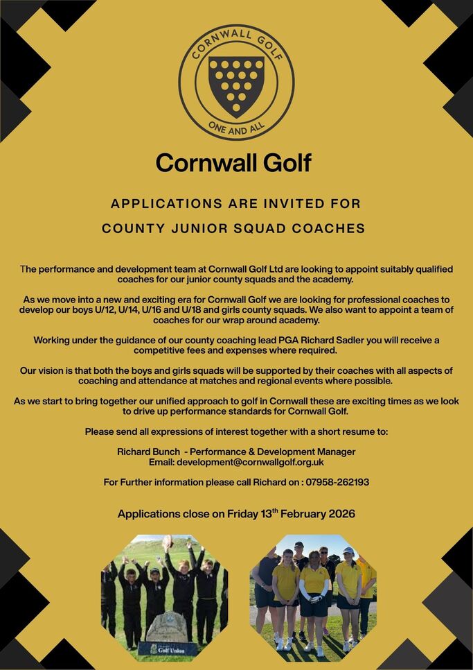 The Performance & Development Team are looking to appoint a team of coaches to drive forward and raise the standards of representative competitive golf in Cornwall.